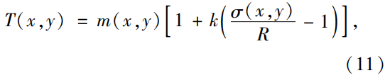 經(jīng)過(guò)大量試驗(yàn)對(duì)比,選擇Sauvola局部二值化算法12進(jìn)行圖像分割。計(jì)算以點(diǎn)(x,y)為中心的窗口模板內(nèi)的灰度均值m(x,y)與標(biāo)準(zhǔn)方差σ(x,y) ,則點(diǎn)(x,y)的閾值T(x,y)為