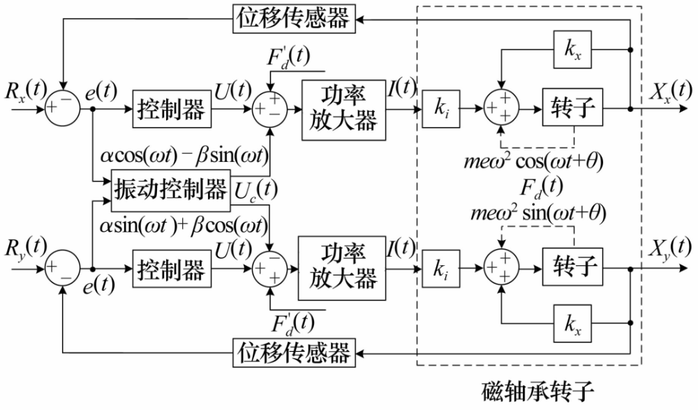 按照抑制分量的不同,軸承電磁力最小控制方法可以分為2種:1)同頻力抑制,只抑制轉(zhuǎn)子不平衡帶來的振動力;2)諧波力抑制,在抑制轉(zhuǎn)子不平衡帶來的振動力的同時,還抑制傳感器諧波噪聲等帶來的諧波振動力